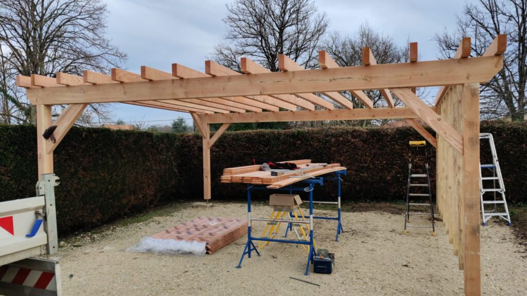 À chaque phase, j’ai réalisé des contrôles précis : aplomb des poteaux, horizontalité des sablières (la sablière court en bas de la toiture et reçoit les chevrons), alignement et espacement des chevrons, serrage des fixations. Le bois a été traité en classe d’emploi extérieure (protection contre insectes et humidité) et j’ai fourni des recommandations de finition (saturateur ou lasure) au client pour garantir l’esthétique sur le long terme.