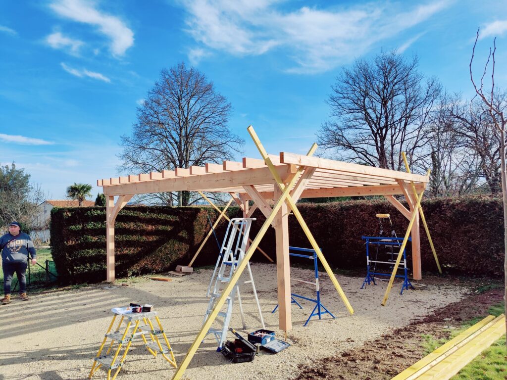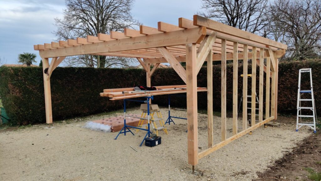 Les étapes clés : préparation du terrain et coulée des plots béton, usinage et prédécoupe des pièces en atelier, ancrage des platines, calage et mise d’aplomb des poteaux, levage et fixation des poutres porteuses, pose des chevrons selon entraxe défini, puis vérifications d’équerrage et d’horizontalité.