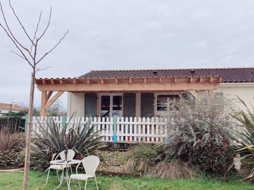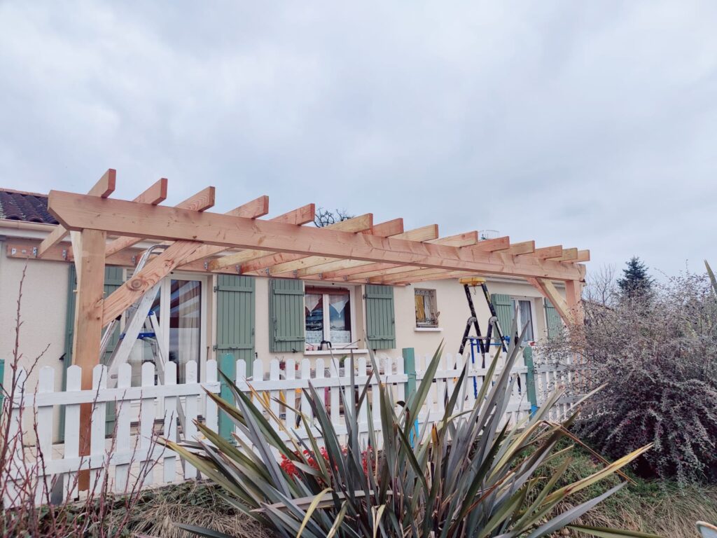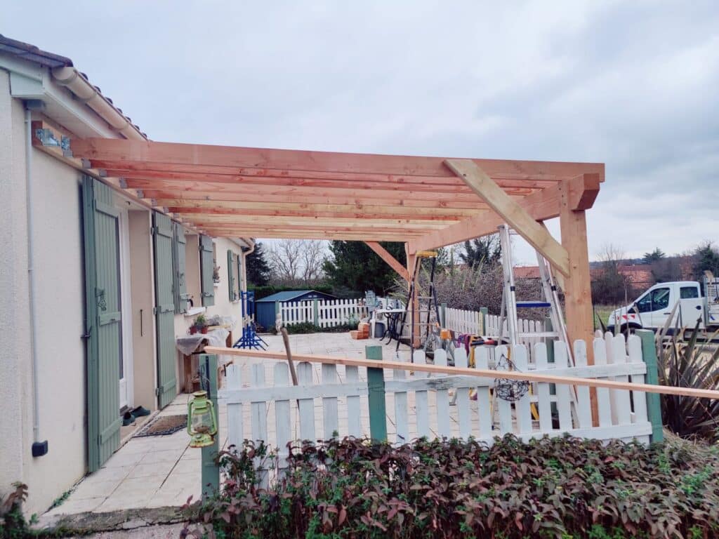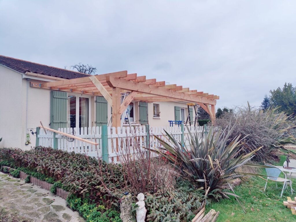Une pergola en Douglas de 6 mètres à Ribérac, posée contre une façade existante, avec une contrainte claire : créer un espace ombragé côté jardin sans alourdir la lecture architecturale de la maison. Chez JPJ PRO 24 RÉNOVATION, on accompagne ce type de projet de A à Z — de la prise de cotes jusqu’à la vérification finale des aplombs — avec un interlocuteur unique tout au long du chantier. C’est d’ailleurs ce qui ressort souvent de nos projets réalisés : une continuité dans le suivi, et un travail qui s’adapte aux réalités du terrain plutôt qu’à un plan théorique. Si vous êtes curieux de voir ce que donnent nos réalisations bois en conditions réelles, notre page dédiée à un carport 2 voitures à Ribérac illustre bien notre approche du Douglas sur mesure…