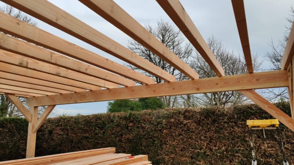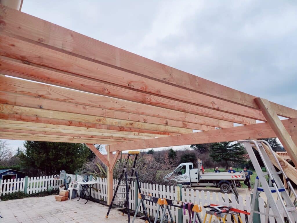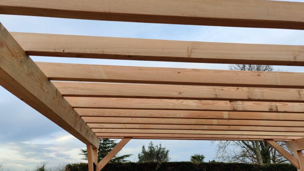 Le Douglas purgé d’aubier (bois naturellement durable, classé en classe 3) s’imposait pour ce type d’ouvrage extérieur. Chaleureux à l’œil, stable dans le temps, et suffisamment résistant pour absorber les efforts d’une grande portée. Les poutres principales ont été dimensionnées autour de 120×120 mm à 140×140 mm selon les charges calculées, avec des solives transversales en 45×140 mm ou 60×160 mm suivant l’espacement retenu.